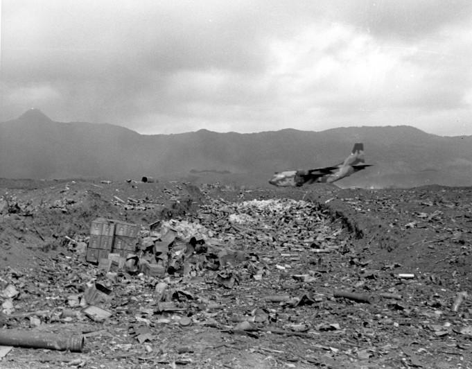 (112) Resupply--An Air Force C-123 touches down at Khe Sanh beyond the leveled ammunition dump.