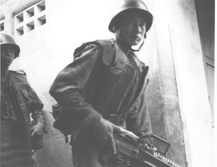 Vietnamese paratroopers cautiously move down alleyway as they advance on Viet Cong positions routing the enemy in the Phu Nhuan section of the capital city. The fierce battle ensued as the Viet Cong attacked during the early morning hours of January 31, 1968, the festive TET holiday period for the Vietnamese people.