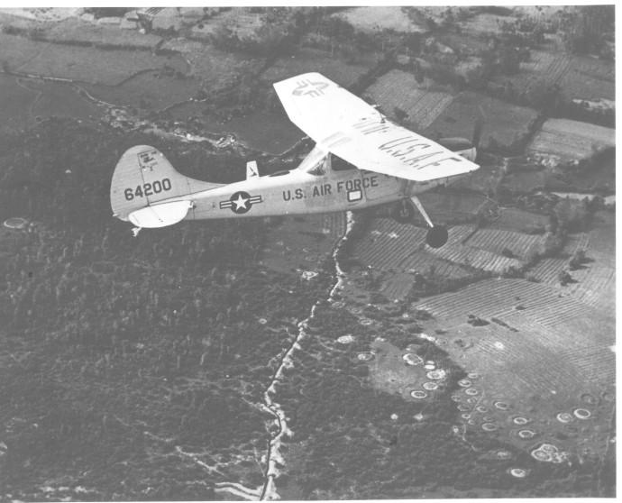 Flying above peaceful-looking South Vietnam countryside at 145 kilometers an hour is a single-engine O-1E Bird Dog spotter aircraft flown by a US Air Force forward air controller (FAC), who detects targets for artillery gunners and tactical pilots. Forty percent of the flying time legged by all Seventh US Air Force pilots in 1966 was flown by FACs.