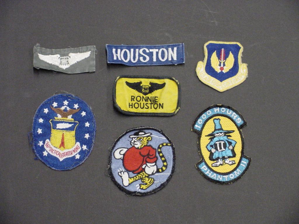 1000 Hours Phantom II patch; 36th Tactical Fighter Wing patch; Ronnie Houston name patch; US Air Forces in Europe patch; Houston name patch; embroidered wings patch; strutting tiger patch all worn while serving with 36th Tactical Fighter Wing in Bitberg, Germany (February 1971 - March 1974).