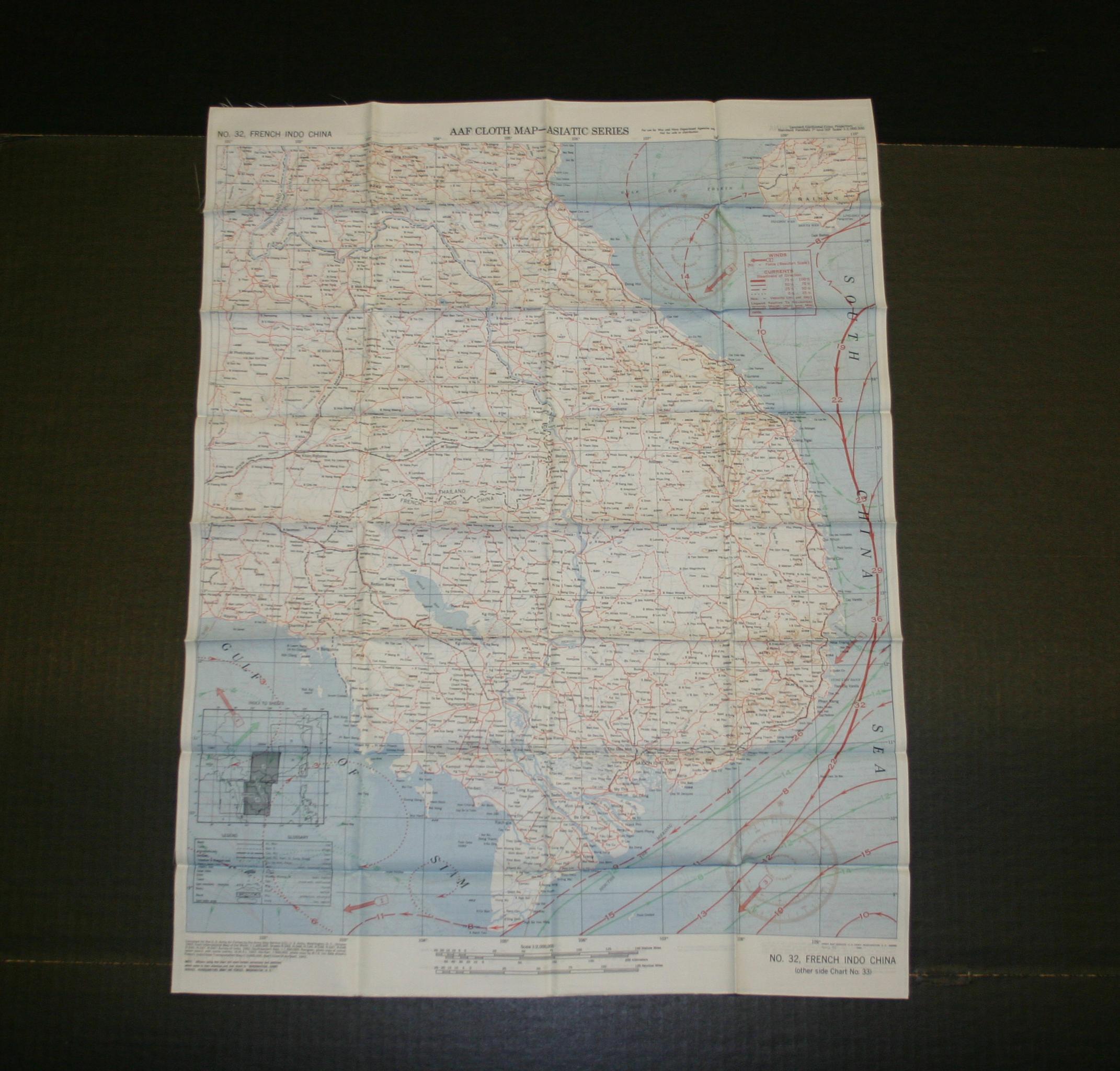 AAF (Army Air Force) Cloth Map - Asiatic Series. Obverse: French Indochina (No. 32) Reverse: Central China (No. 33). Found at a flea market in Bryan - College Station, Texas, 2001.