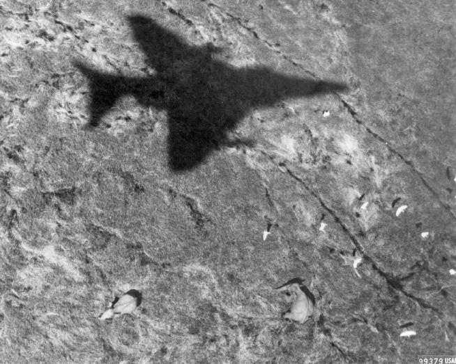 SUPERSONIC INTRUDER: The shadow of a U.S. Air Force RF-4C Phantom photo reconnaissance aircraft streaks across a Vietnamese elephant grazing area during a recent daylight mission. Startled elephants and water birds react to the low-flying double-sonic photo aircraft. Air Force Phantom pilots fly daily reconnaissance missions over North and South Vietnam gathering intelligence for air strikes.
