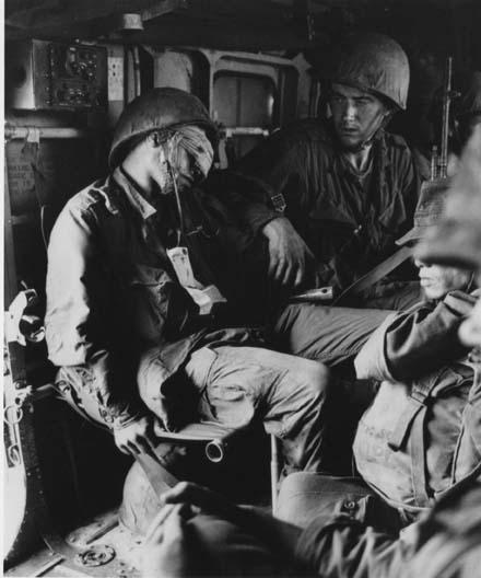Wounded American Marine rests as he is evacuated from a battle zone near Gia Binh, South Vietnam.
