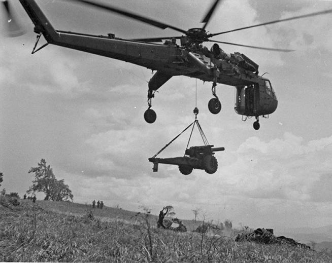 A CH-54A helicopter making an aerial delivery of a howitzer during Operation Boiling. - Photographer: Thomas Larsen