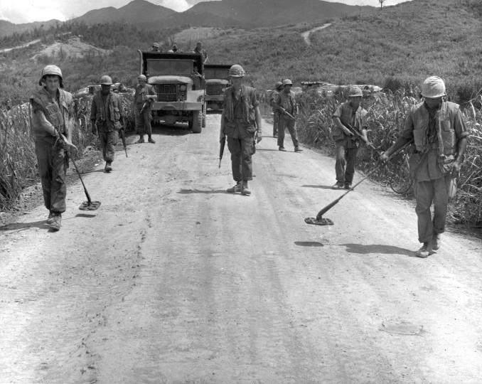 Mine Sweep-- A Marine mine sweep team of "A" Company, 3rd Engineer Battalion, checks a road west of Ca Lu for enemy Mines or dud rounds. This sweep, like many others in the Northern I Corps, is conducted each morning before traffic is permitted to use the road.