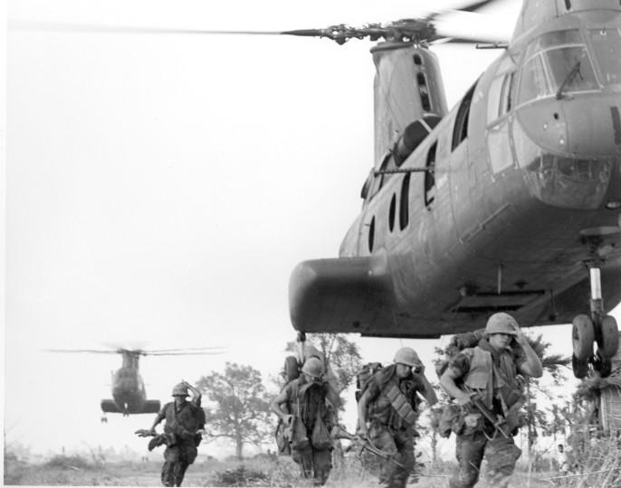 First wave-- Leatherneck helicopter of Marine Medium helicopter of Marine Medium Helicopter Squadron 164 and infantryman of the 2nd Battalion, 5th Marine Regiment, are the first elements into the zone, November 20 during Operation Mead River, about eight miles southwest of Danang. More than 75 helicopters of the 1st Marine Aircraft Wing lifted some 3,500 leathernecks into pre-designed zones ...