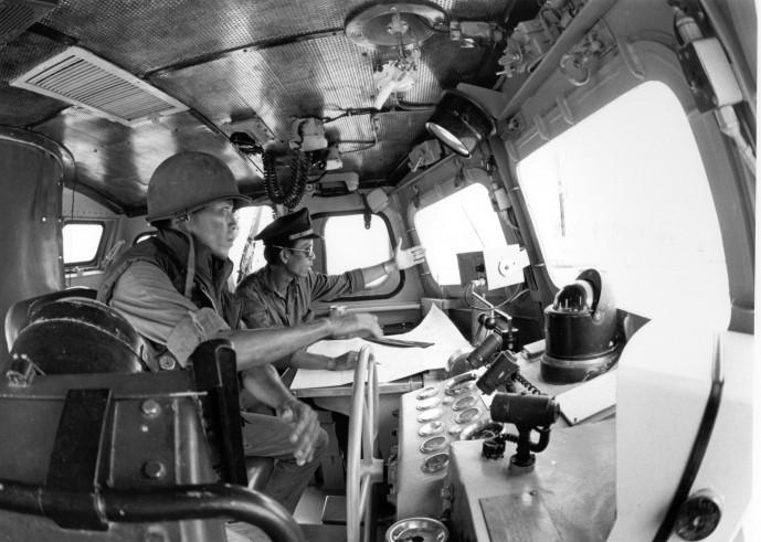 Cockpit of patrol boat with officer and enlisted helmsman