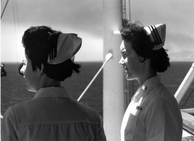 At sea... Nurses on board the hospital ship USS Sanctuary (AH-17) Enjoy the fresh air and sunshine on the deck