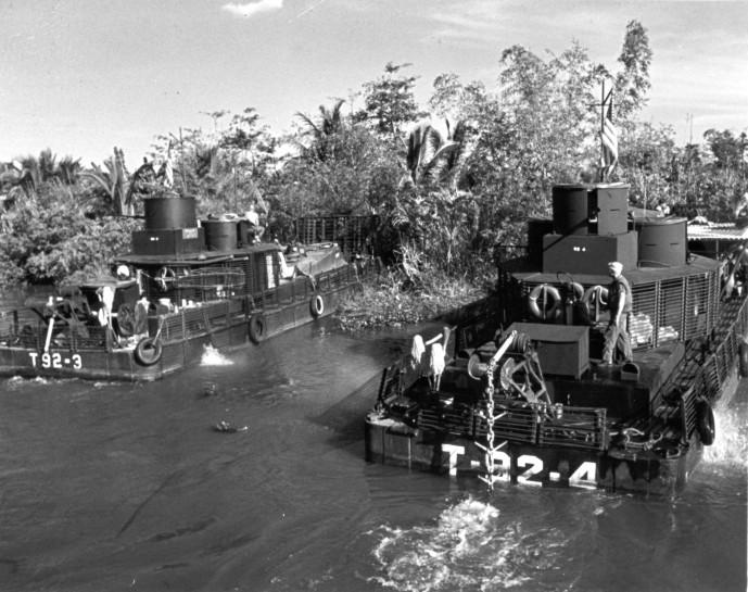 Mekong Delta, Republic of Vietnam.. US Navy armored troop carriers(ATC) of the Joint US Army-Navy Mobile Riverine Force Beach along a Mekong Detal Canel during Operations Coronado IX