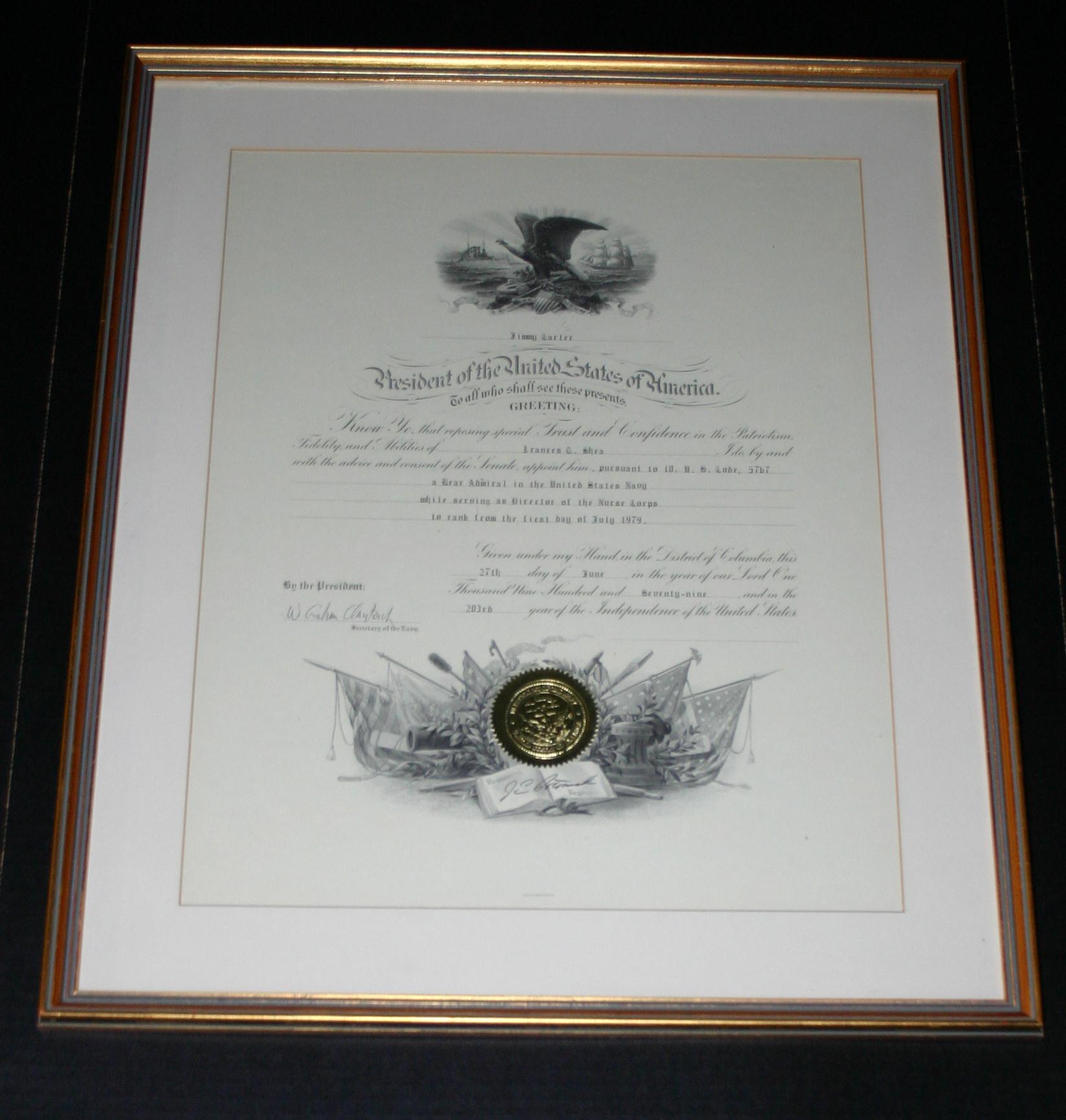 Framed presidential proclamation announcing the promotion of Frances Shea to the rank of Rear Admiral in the U.S. Navy