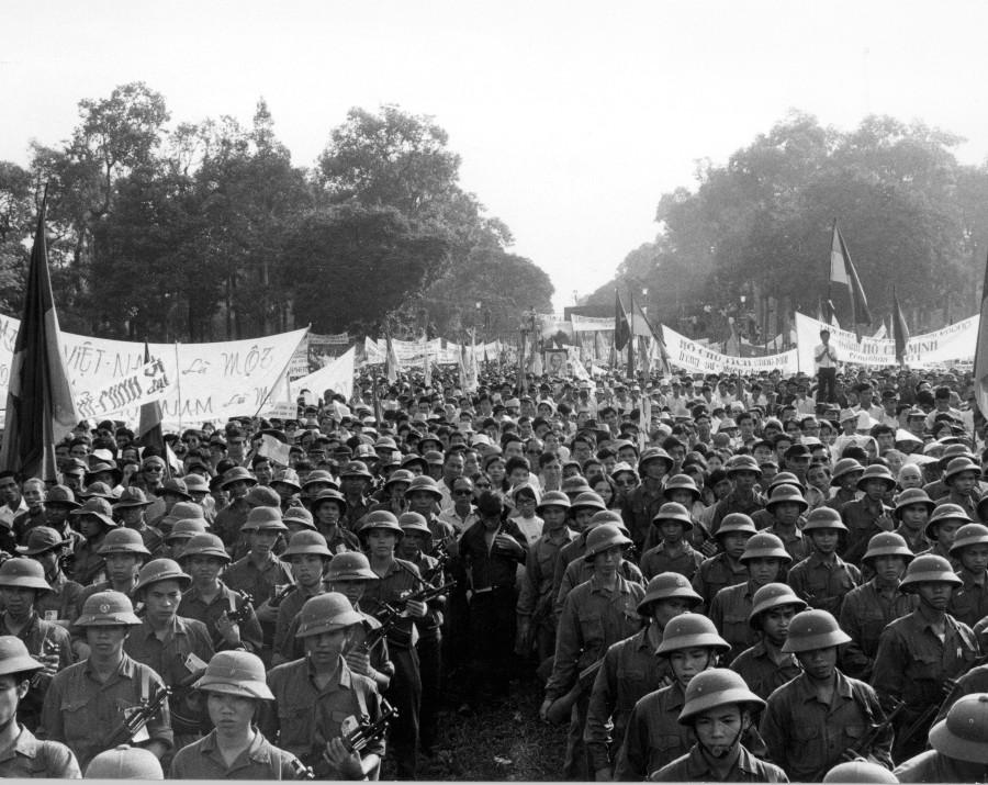 Liberation of Saigon Celebrated--Soldiers of PRG and North Vietnamese troops are shown attending the rally staged in front of the Du Doc Lap (former presidential place) in Saigon on May 7th to celebrate the liberation of Saigon. During the rally, General Tran Van Tra, chairman of the Military Management Committee of PRG, was presented to South Vietnamese people.