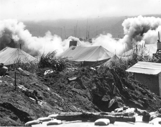(115) An eruption of smoke and dust obscures part of the beleaguered Marine Combat base at Khe Sanh during a recent North Vietnamese rocket attack.